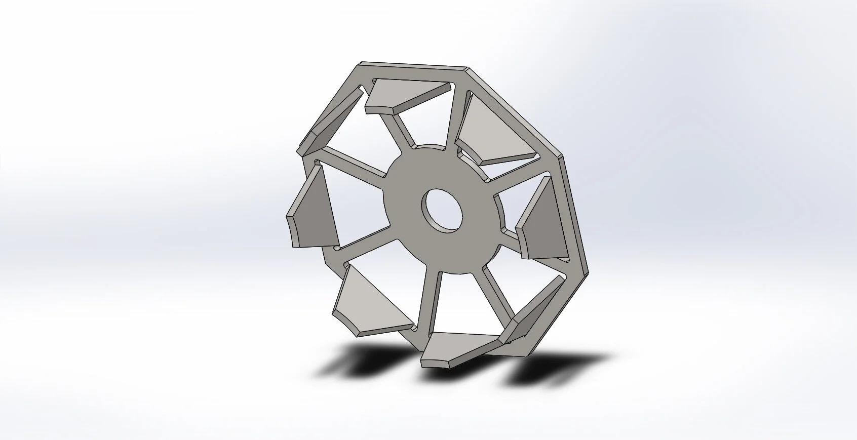 By bending the “leafs” outward, it moved mass away from the center which increases the moment of inertia (MoI). Initially this resulted in a MoI larger than the original flywheel, so the overall size of the flywheel was reduced until the desired MoI was achieved as well as increasing the number of units produced per sheet. Solidworks was used to make this analysis.
