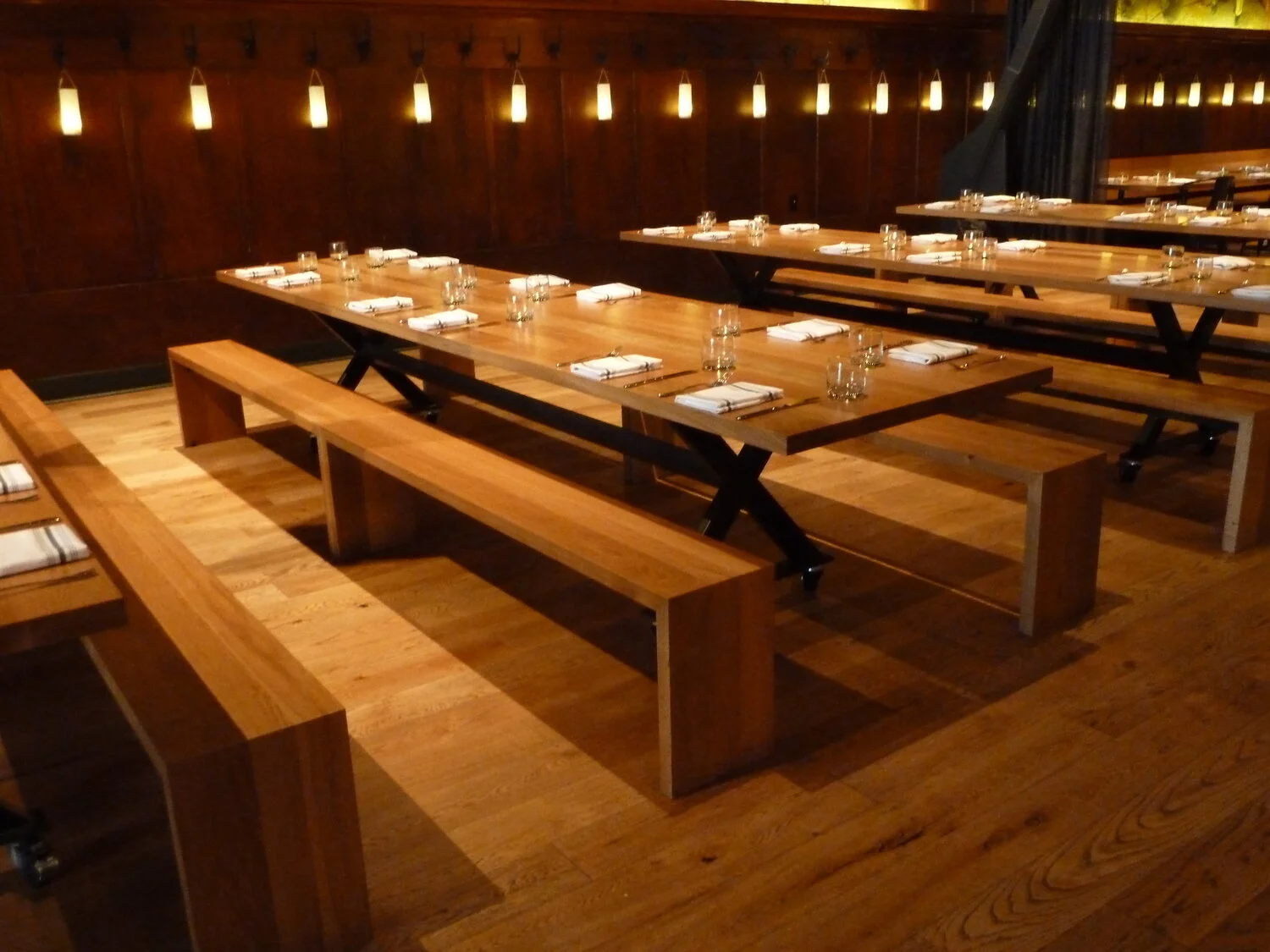 The oak wood for the tables and benches was fumed with ammonia in a custom built vapor chamber. This maked the oak look older/darker and less yellow and bright.