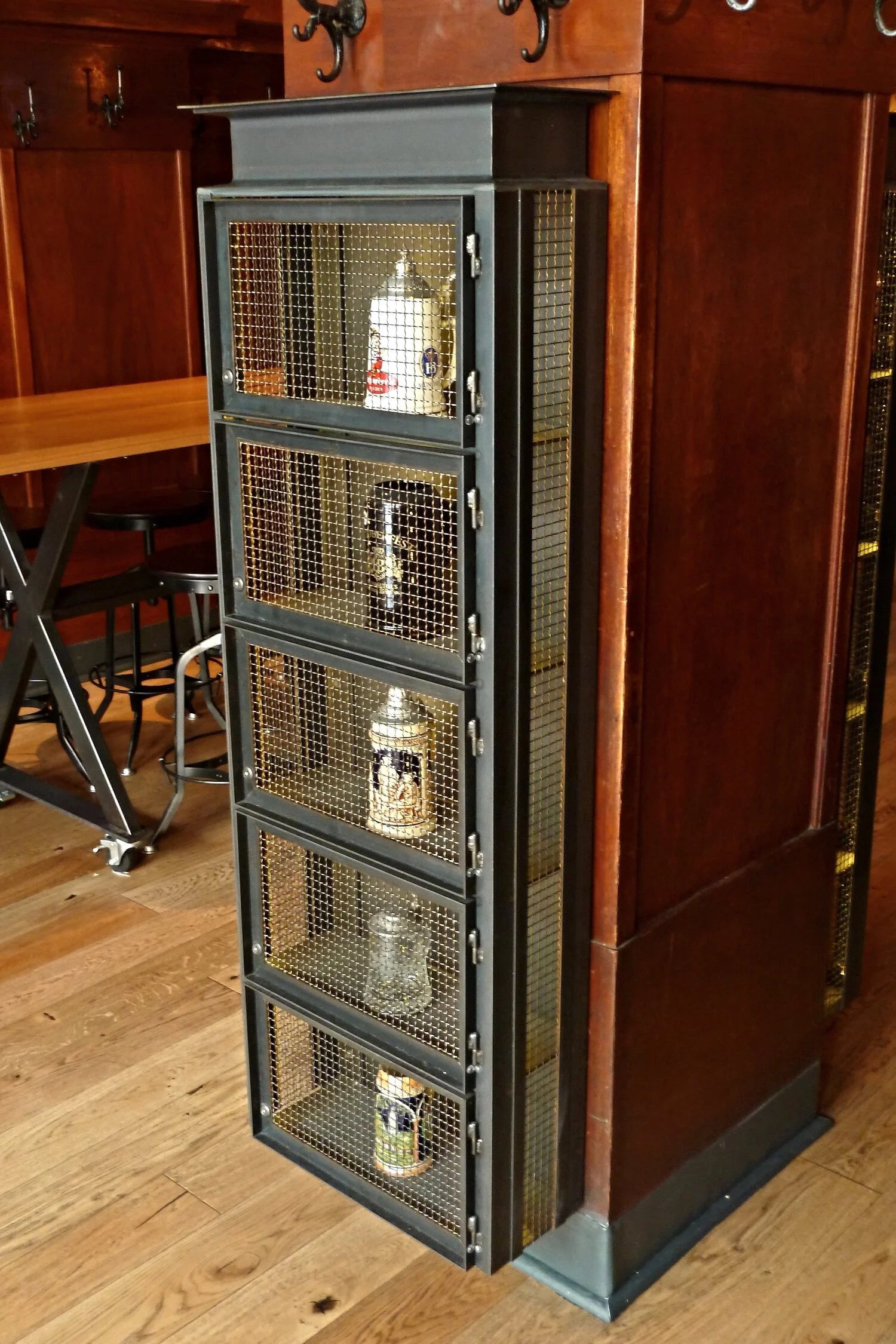 Custom beer stein lockers were made using angle iron and stainless steel mesh. Each locker was fitted with a lock so that customers could rent a locker to store their personal beer stein.
